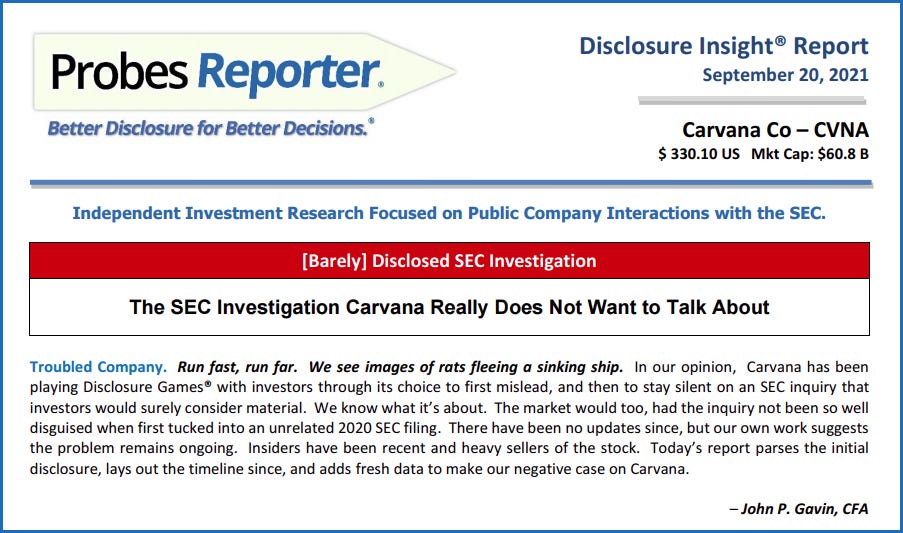 Sep-2021: Disclosure Insight, then known as Probes Reporter, issued a warning on Carvana in Sep-2021, at $330/share. This went on to become one of our best calls, as the stock fell to about $5 by Dec-2022. Our full Sep-2021 warning is worth your time. It’s posted with this report.