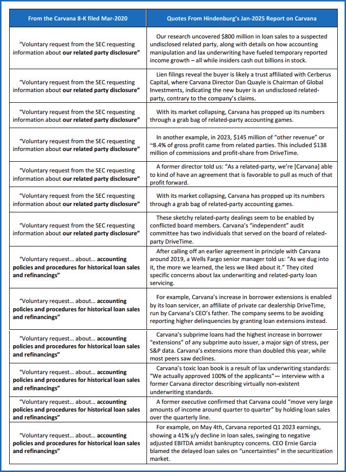 Relevant excerpts from the Mar-2020 8-K, the Jan-2025 Hindenburg Research report, and Carvana’s SEC subpoena disclosure appear later in this report.