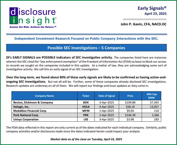 DI’s EARLY SIGNALS are only POSSIBLE indicators of SEC investigative activity. We are publishing these data to give you the earliest indication of the existence of a possible SEC investigation.