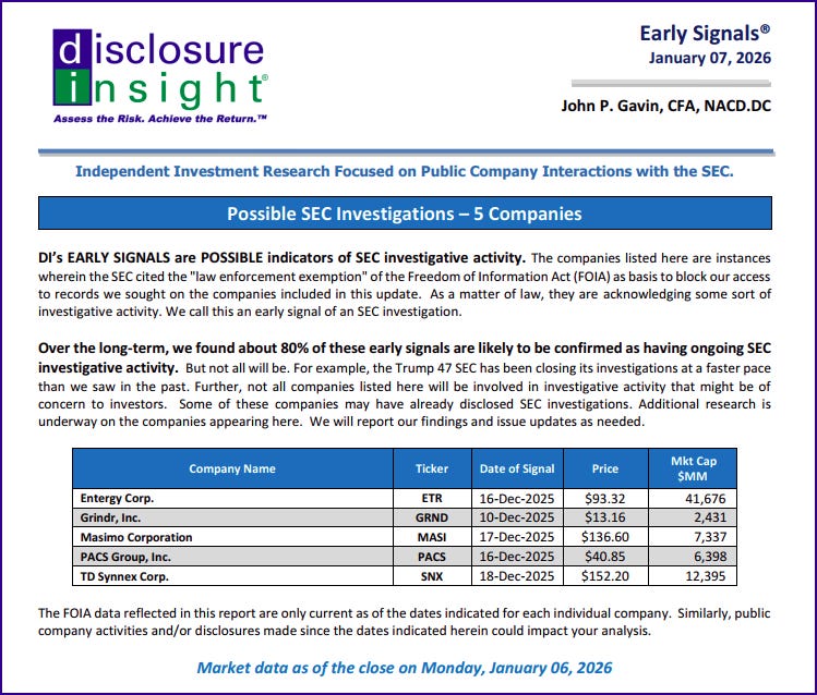 DI’s EARLY SIGNALS are only POSSIBLE indicators of SEC investigative activity.