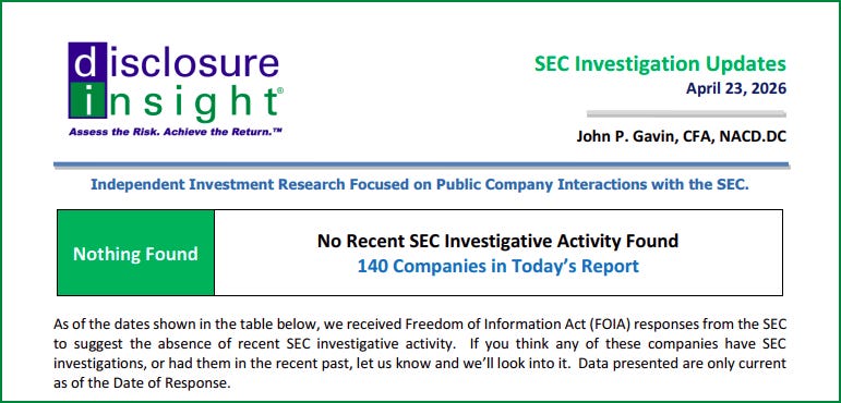 SEC Investigation Updates - April 23, 2026 No Recent SEC Investigative Activity Found - 140 US-Registered CompaniesApr 22, 20262ShareYou need to click on the printable PDF here to access this report.SEC Investigation Updates - NF - April 23, 2026445KB ∙ PDF fileDownloadDownloadShareDisclosure Insight® is a reader-supported publication. To receive new posts and support my work, consider becoming a subscriber.Subscribe