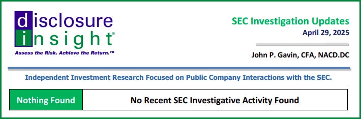 SEC Investigation Updates - April 29, 2025 No Recent SEC Investigative Activity Found - 120 CompaniesApr 29, 20251ShareYou need to click on the printable PDF here to access this report.SEC Investigation Updates - NF - April 29, 2025318KB ∙ PDF fileDownloadDownloadShareDisclosure Insight® is a reader-supported publication. To receive new posts and support my work, consider becoming a subscriber.Subscribe
