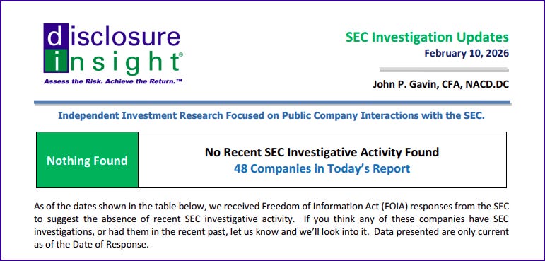 SEC Investigation Updates - February 10, 2026 No Recent SEC Investigative Activity Found - 48 US-Registered CompaniesFeb 10, 20265ShareYou need to click on the printable PDF here to access this report.SEC Investigation Updates - NF - February 10, 2026285KB ∙ PDF fileDownloadDownloadShareDisclosure Insight® is a reader-supported publication. To receive new posts and support my work, consider becoming a subscriber.Subscribe
