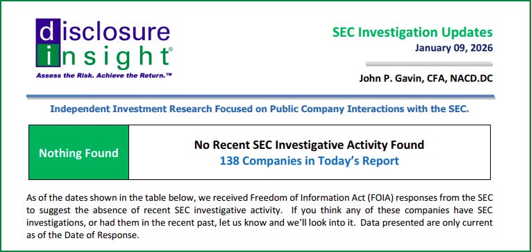 SEC Investigation Updates - January 09, 2026 No Recent SEC Investigative Activity Found - 138 CompaniesJan 09, 202641ShareYou need to click on the printable PDF here to access this report.SEC Investigation Updates - NF - January 09, 2026336KB ∙ PDF fileDownloadDownloadShareDisclosure Insight® is a reader-supported publication. To receive new posts and support my work, consider becoming a subscriber.Subscribe