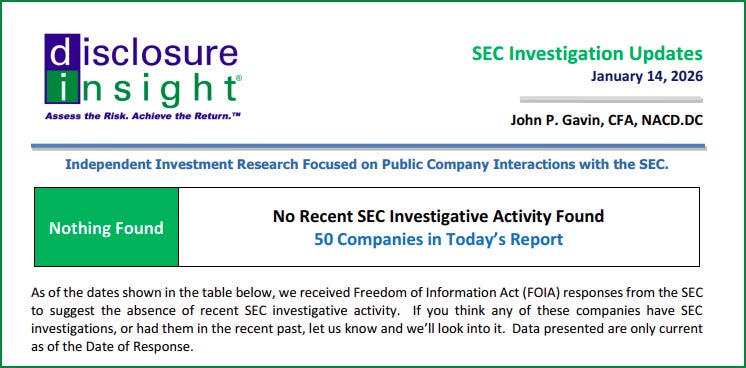 SEC Investigation Updates - January 14, 2026 No Recent SEC Investigative Activity Found - 50 US-Registered CompaniesJan 14, 20263ShareYou need to click on the printable PDF here to access this report.SEC Investigation Updates - NF - January 14, 2026285KB ∙ PDF fileDownloadDownloadShareDisclosure Insight® is a reader-supported publication. To receive new posts and support my work, consider becoming a subscriber.Subscribe