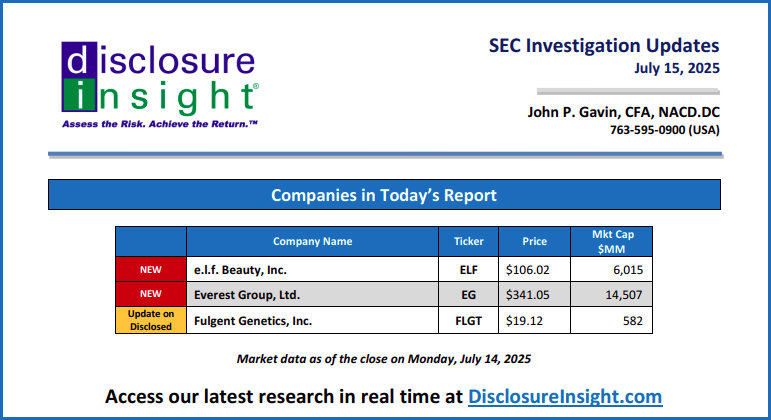 New Warning. Early signal received on 24-Jan-2025, then confirmed as an ongoing investigation on 24-Apr-2025. First investigation we found since we started covering ELF in Apr-2020. Added to DI Watch List.
