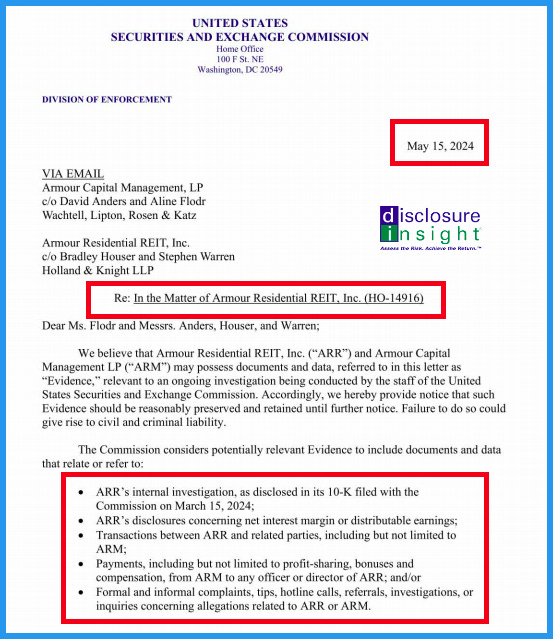 Undisclosed SEC investigation ends, we have some of the records. Primarily focused on Armour’s relationship with Armour Capital Management, the documents we obtained are from May-2024 to Jul-2025. An excerpt is cited below.