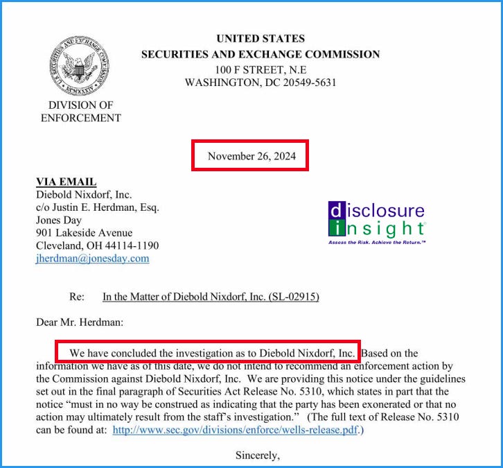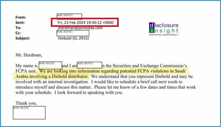 Undisclosed SEC investigation ends, we have some of the records. They show this was a Foreign Corrupt Practices Act (FCPA) investigation involving a Diebold distributor in Saudi Arabia.