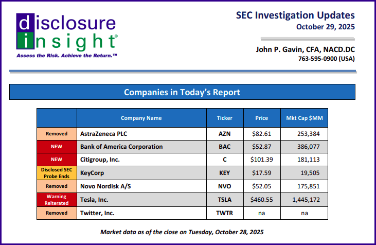 Maintained on DI Watch List. We’ve been tracking an undisclosed SEC investigation here since Dec-2023, with enforcement proceedings again confirmed as ongoing on 02-Sep-2025. AZN appears to be a FCPA frequent flyer, going back to 2010. No clear disclosure of SEC investigative activity found since the 20-F filed on 21-Feb-2023, at which time AZN referred to having fully resolved a FCPA investigation with the SEC in Jul-2020.