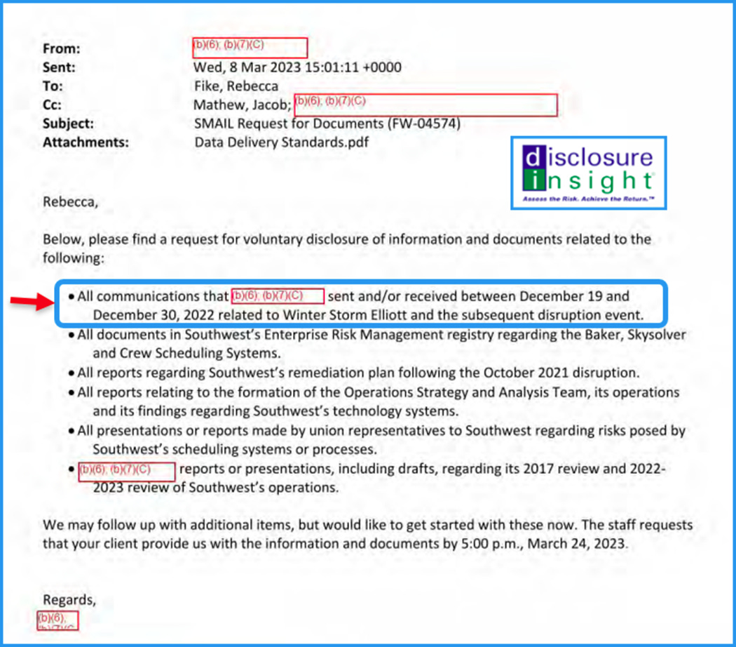 Undisclosed SEC investigation ends; we have some of the records. This was an investigation into massive flight cancellations in Dec-2022 due to Winter Storm Elliott. An 8-K at the time disclosed that Southwest estimated it lost $400 to $425 million in revenue from this disruption. Our work suggests Southwest may have known about this latest SEC probe since at least Jul-2023. It ended in Sep-2024. We got the related documents in Sep-2025.