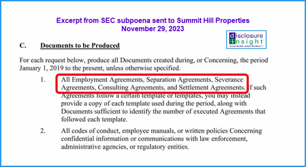 You don’t want to see one of these investigations at a company. They signal the SEC had concern about possible violations of an SEC rule where the company could have potentially used employment/consulting agreements or releases to deter people from communicating directly with the SEC about potential securities law violations. We were tracking this since our Early Signal first received in Aug-2024. Summit’s involvement in this investigation ended in Mar-2025. Here’s the documents the SEC requested from the company in a subpoena sent in Nov-2023 –